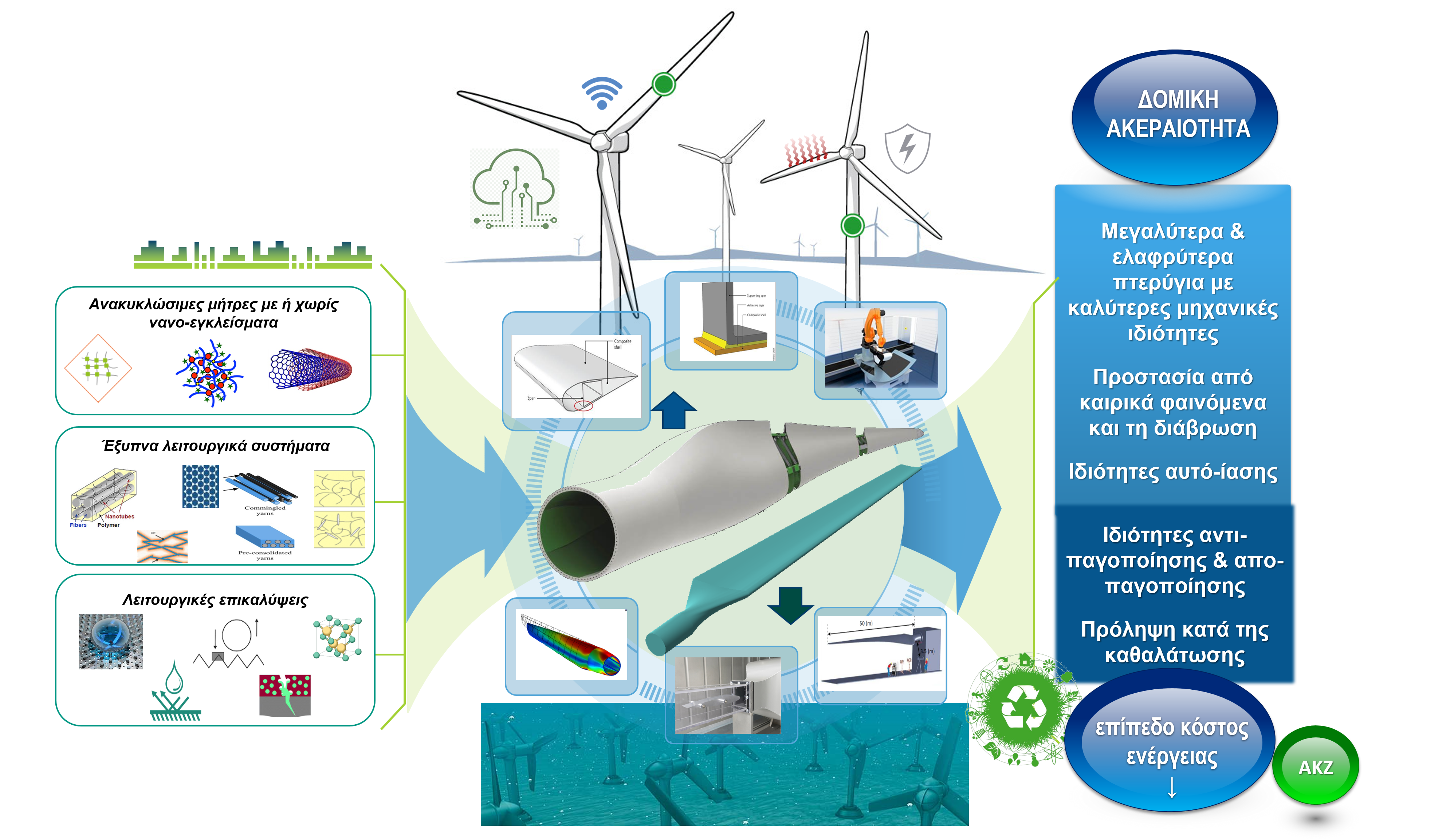 Το RNanoLab καινοτομεί στον τομέα με τρία ευρωπαϊκά προγράμματα που διαχειρίζεται, έχοντας στόχο την ανάπτυξη ανακυκλώσιμων υλικών καθώς και τη μείωση των πρώτων υλών με νέες μεθόδους. Χαρακτηριστικό παράδειγμα είναι το Carbo4Power (βλ. εικόνα 2), που εστιάζει στην παραγωγή πτερυγίων από νέα σύνθετα υλικά, με νέες διεργασίες παραγωγής και συναρμολόγησης, για υποθαλάσσιες –και μη– ανεμογεννήτριες (offshore wind and tidal blades).
