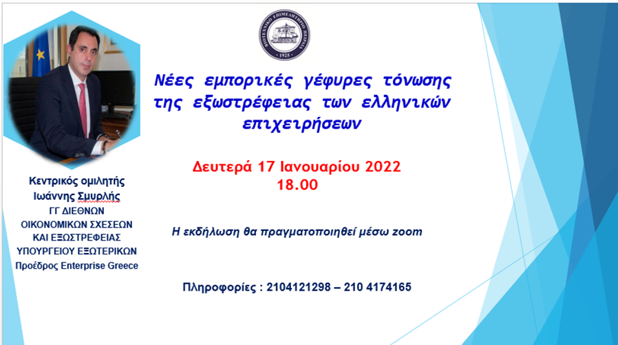Η εκδήλωση αναμένεται να πραγματοποιηθεί μέσω zoom, την Δευτέρα 17 Ιανουαρίου 2022, ώρα 18.00. Ο Κεντρικός ομιλητής της εκδήλωσης θα είναι ο κ. Ιωάννης Σμυρλής, Γ.Γ. Διεθνών Οικονομικών Σχέσεων και Εξωστρέφειας του Υπουργείου Εξωτερικών και Πρόεδρος του Enterprise Greece.