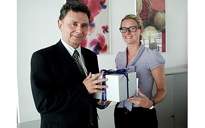 Σε πρόσφατη επίσκεψη, στο Ανόβερο, του Δρ. Αθανάσιου Κελέμη, Γενικού Διευθυντή του Ελληνογερμανικού Επιμελητηρίου, η κα Koehler εκπρόσωπος της Deutsche Messe AG, του παρέδωσε δώρο για τον εορτασμό των 35 χρόνων συνεχούς συνεργασίας.