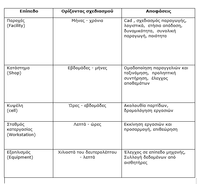 Το Εθνικό Ινστιτούτο Τυποποίησης και Τεχνολογίας της Αμερικής (National Institute of Standards and Technology [NIST]) παρουσίασε ένα μοντέλο το οποίο διακρίνει τις παραγωγικές δραστηριότητες σε πέντε επίπεδα, όπως φαίνεται στον πίνακα 2.