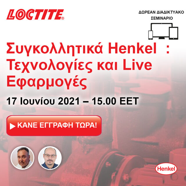 Η εταιρεία Henkel διοργανώνει στις 17 Ιουνίου διαδικτυακό σεμινάριο με τίτλο “Συγκολλητικά Henkel :Τεχνολογίες και Live εφαρμογές”. Το σεμινάριο θα διεξαχθεί στις 3 το μεσημέρι και θα είναι δωρεάν για το κοινό.