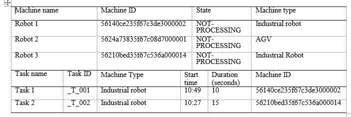 Η πρόταση εφαρμόστηκε σε ένα πραγματικό σύστημα παραγωγής, το οποίο περιείχε τρία συνεργατικά ρομπότ, δύο πανομοιότυπα βιομηχανικού τύπου κι ένα αυτόματο κατευθυνόμενο όχημα (Automated Guided Vehicle [AGV]). Σε αυτό το σύστημα εκτελούνταν μία διαδικασία συναρμολόγησης με δύο εντολές, μία τοποθέτηση κομματιού κι ένα βίδωμα. Οι τύποι των δεδομένων που παρέχονταν στο χρήστη φαίνονται στον πίνακα 2.