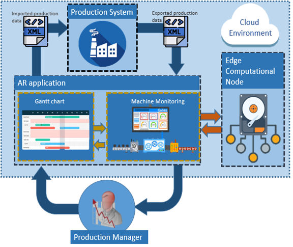Η εφαρμογή AR τροφοδοτείται με υπάρχοντα δεδομένα παραγωγής μέσω πλατφόρμας Cloud, και στη συνέχεια τροφοδοτεί το πληροφορικό σύστημα της παραγωγής ώστε να επιτρέπει τη λήψη αποφάσεων και την αλληλεπίδραση στο σύστημα. Συγκεκριμένα υποστηρίζει: