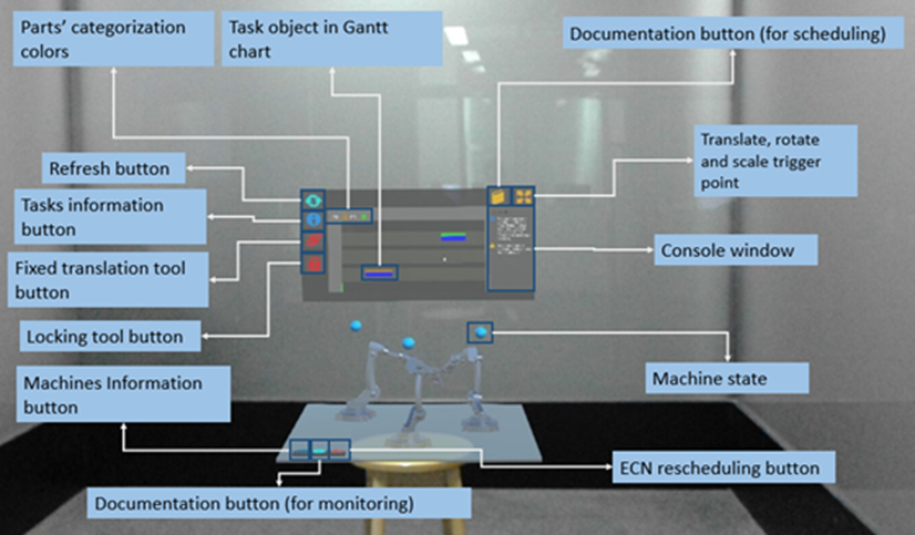 Το χρονοπρόγραμμα παραγωγής αναπαρίσταται μέσω ενός διαγράμματος Gannt (οριζόντιο ραβδόγραμμα που απεικονίζει στην ουσία τη σχέση των διαφορετικών δράσεων του έργου μέσα στο χρόνο) και μίας τρισδιάστατης απεικόνισης του χώρου εργασίας. Η δυνατότητα αλληλεπίδρασης απαιτεί αρχικά τη ρύθμιση της εφαρμογής σε σχέση με το ψηφιακό σύστημα. Τέλος, οι αλλαγές στο ψηφιακό σύστημα (Digital Twin / Simulation Model) προωθούνται και εφαρμόζονται στο πραγματικό σύστημα παραγωγής (βλέπε σχήμα 1).