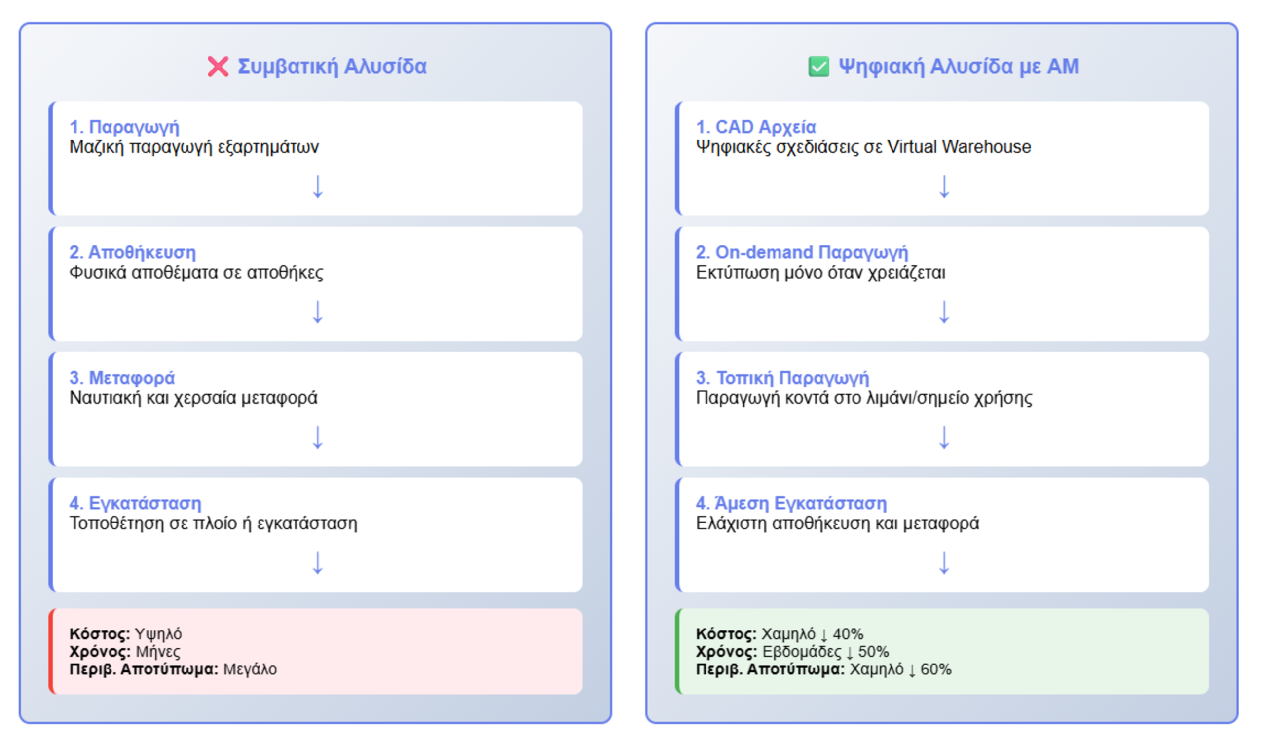 Η προσθετική κατασκευή (Additive Manufacturing [ΑΜ]) αναδύεται ως εναλλακτική μέθοδος που υπόσχεται μείωση του βάρους των εξαρτημάτων, βελτίωση της υδροδυναμικής απόδοσης και ορθολογική διαχείριση της εφοδιαστικής αλυσίδας. Πλέον η ναυπηγική υιοθετεί μοντέλα κυκλικής οικονομίας, μειώνοντας περιβαλλοντικές επιπτώσεις και ενισχύοντας τη λειτουργική αυτονομία των σύγχρονων στόλων.