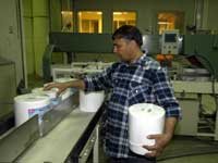 Ακολουθεί η φάση της συσκευασίας. Με χρήση ταινιόδρομων το παραγόμενο προϊόν προωθείται και σταδιακά ψεκάζεται με μικρή ποσότητα κόλλας προκειμένου να μπει η επιθυμητή εταιρική ετικέτα. Στη συνέχεια συσκευάζεται μέσα σε φιλμ πολυουλεθίνης, το οποίο είναι ειδικό για τρόφιμα.